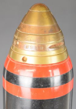 British WW1 18lb shrapnel shell dated 1916 to base, with projectile and fuse cone