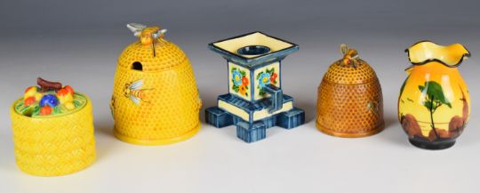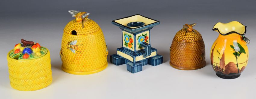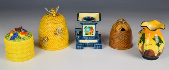 Japanese preserve / honey pots, vase and candlesticks including Marutomo ware, tallest 12cm