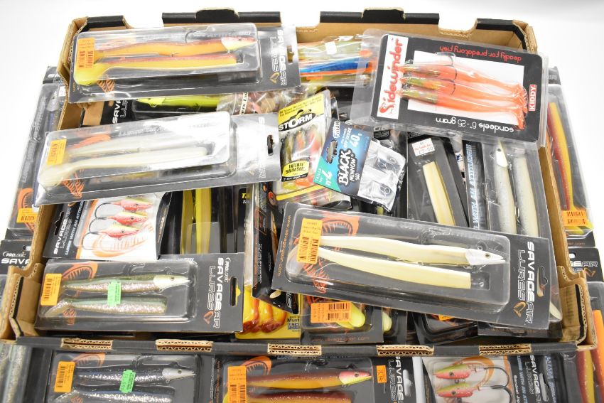 Approximately 50 sea / pike fishing lures including Sidewinders, Storm, Savage, all in original packaging