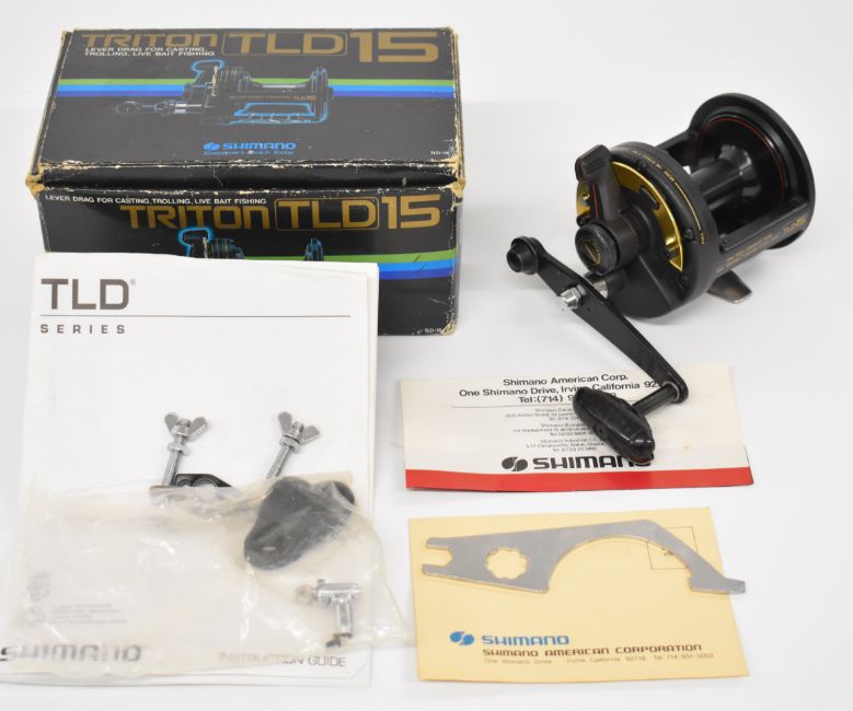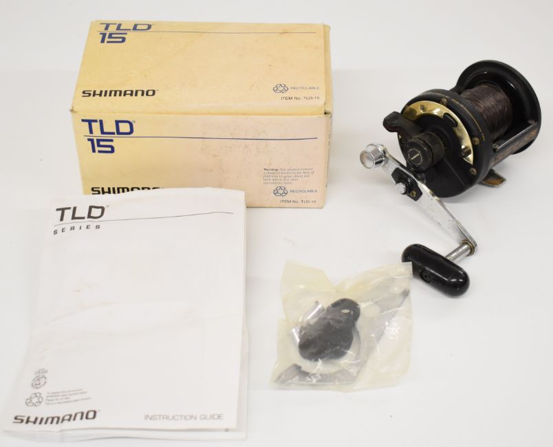 Three Shimano TLD 15 multiplier fishing reels, all boxed with paperwork / accessories