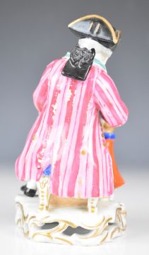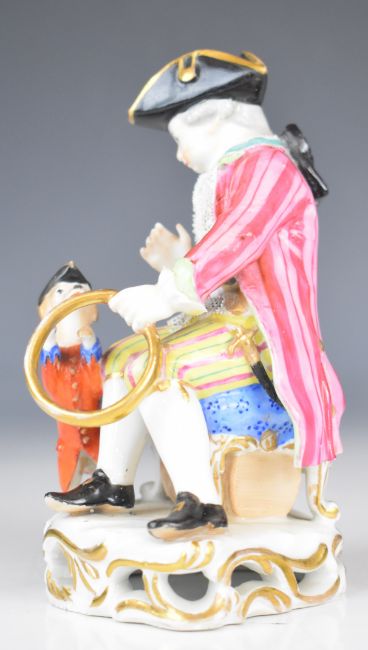 Meissen 19thC figure of a man with a performing dog jumping through a hoop, height 12cm
