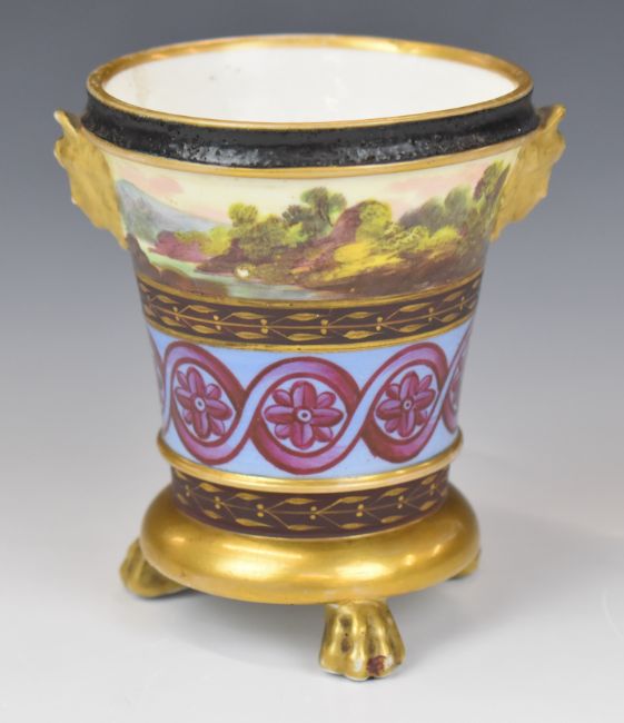 Coalport c1805 spill vase with hand painted landscape scene, raised on three lion pad feet, height 9.5cm