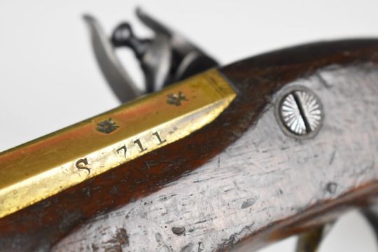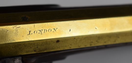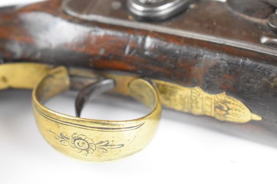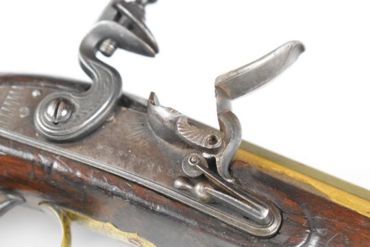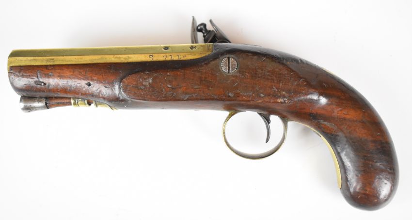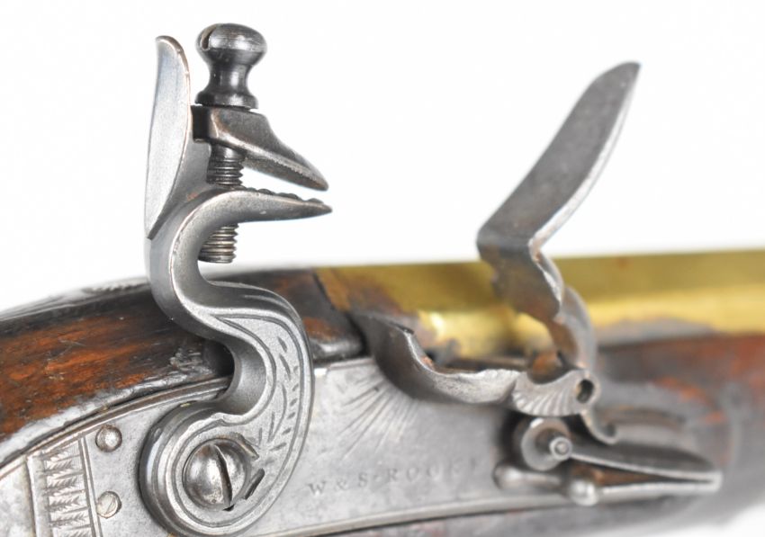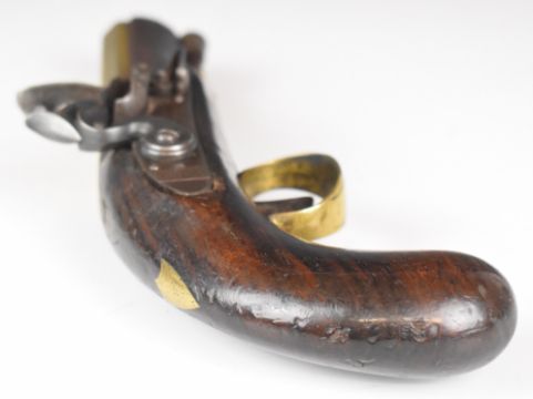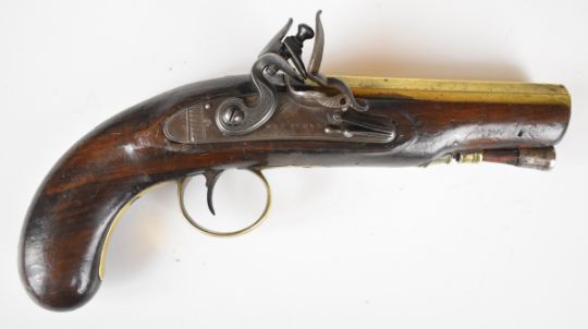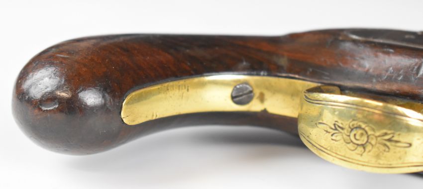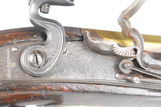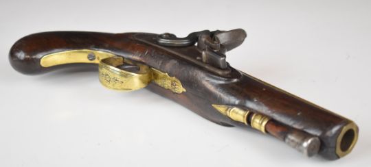 W & S Rooke of London 32 bore flintlock pistol with named and engraved lock, engraved brass trigger guard, top plate and hammer, steel tipped wooden ram-rod, vacant shield shaped cartouche to the wrist and 5 inch smooth bored octagonal brass barrel, overall length 25.5cm.