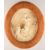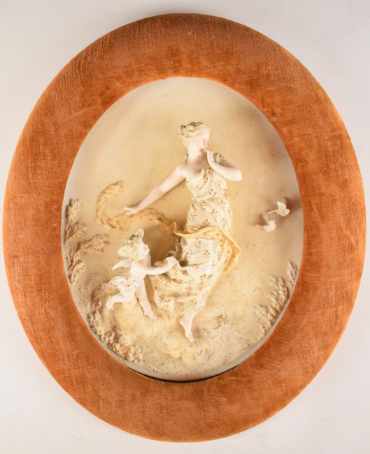 Continental porcelain plaque with figural decoration in relief of a female figure with cherub and doves, 28 x 22cm