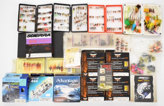 Fly fishing lines, flies and boxes including wet and dry flies, nymphs etc