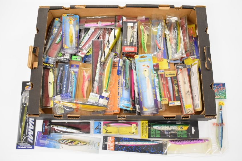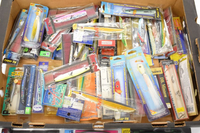 Large quantity of sea / pike fishing lures in several bags / wallets and loose including, Rapala, Abu, Yo-Zuri etc, in two trays