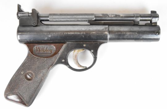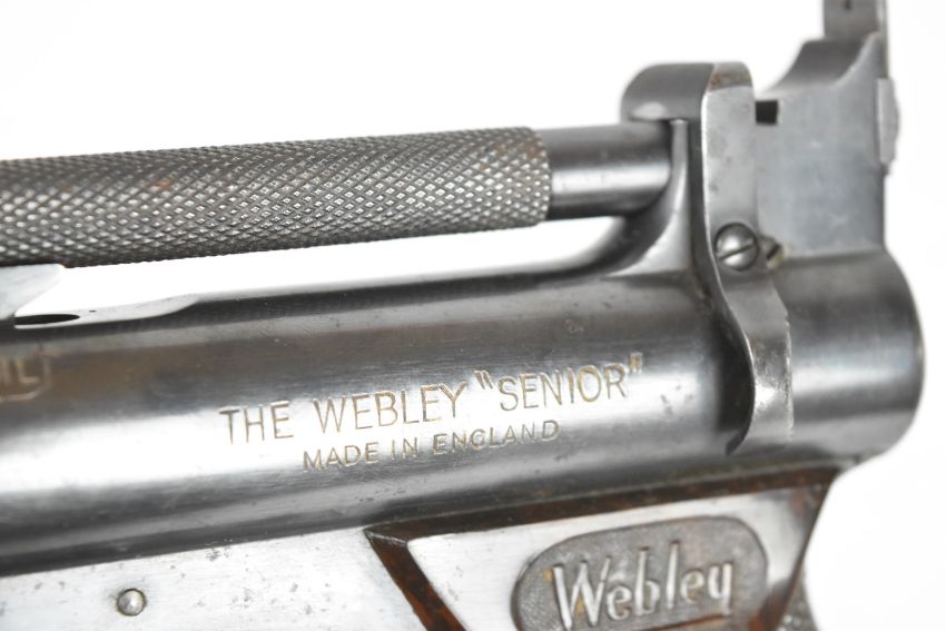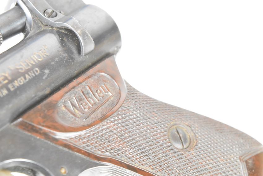 Webley Senior .177 air pistol with named and chequered Bakelite grips and adjustable sights, serial number 440.