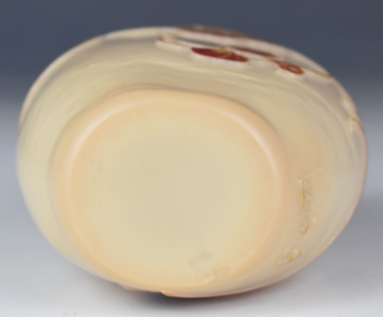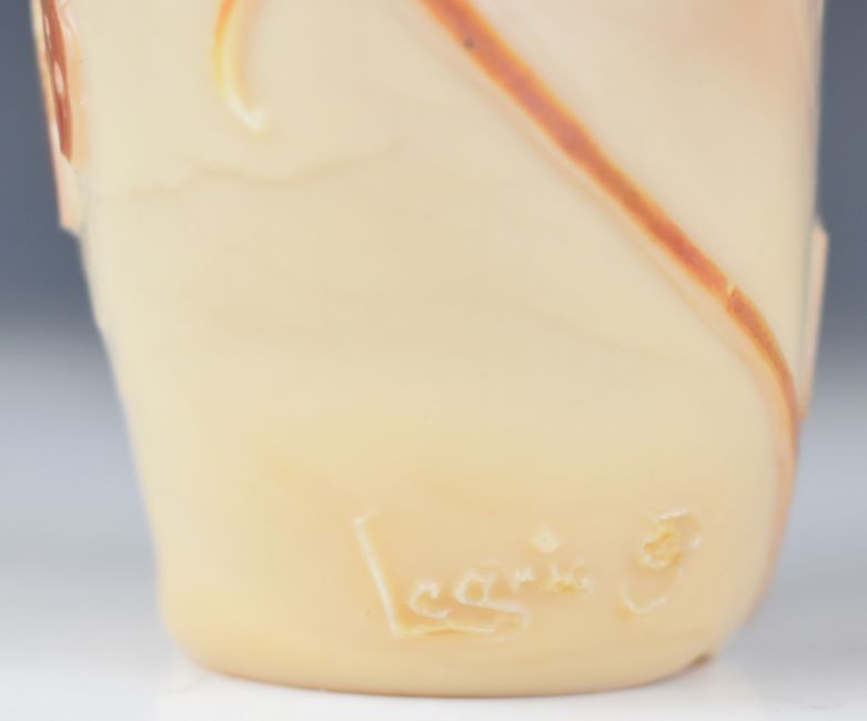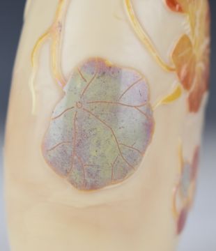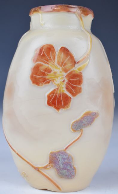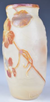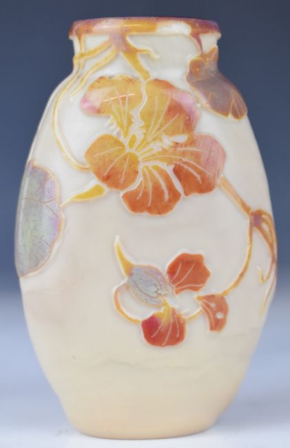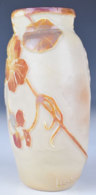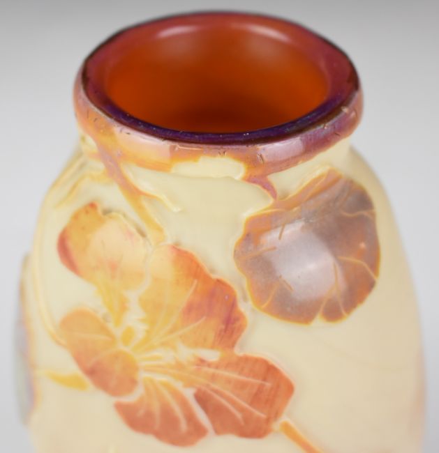 Legras cameo glass vase of flattened ovoid form cased in iridescent blue, red and brown and with cut decoration of hibiscus and foliage, signed to the body, 13.5cm tall