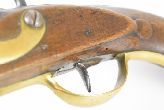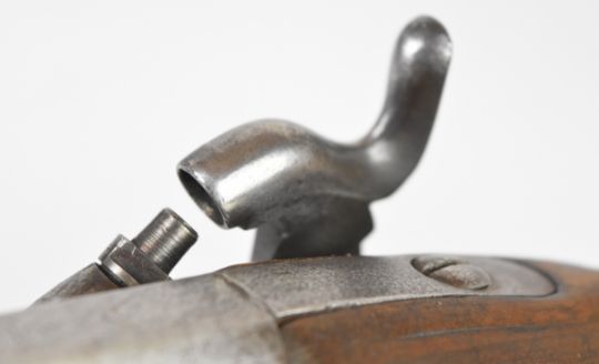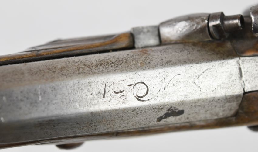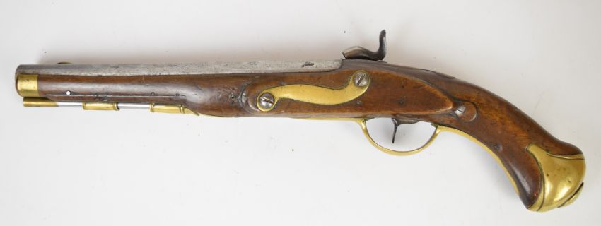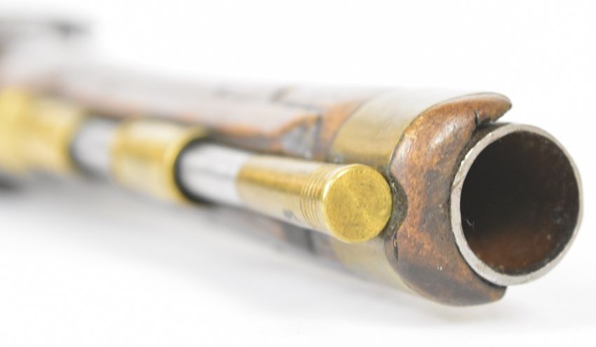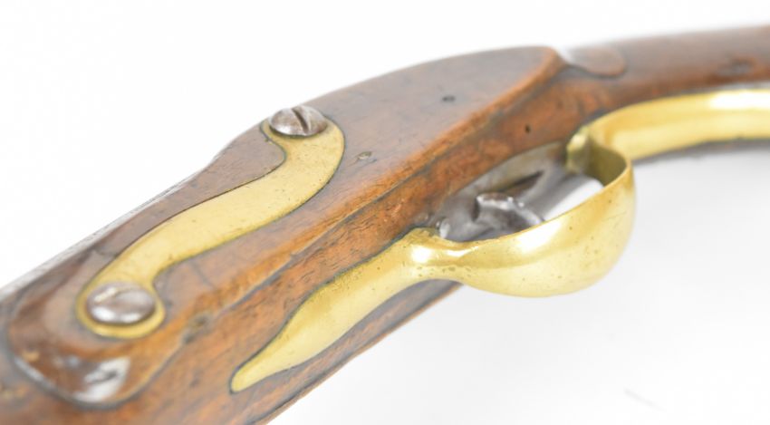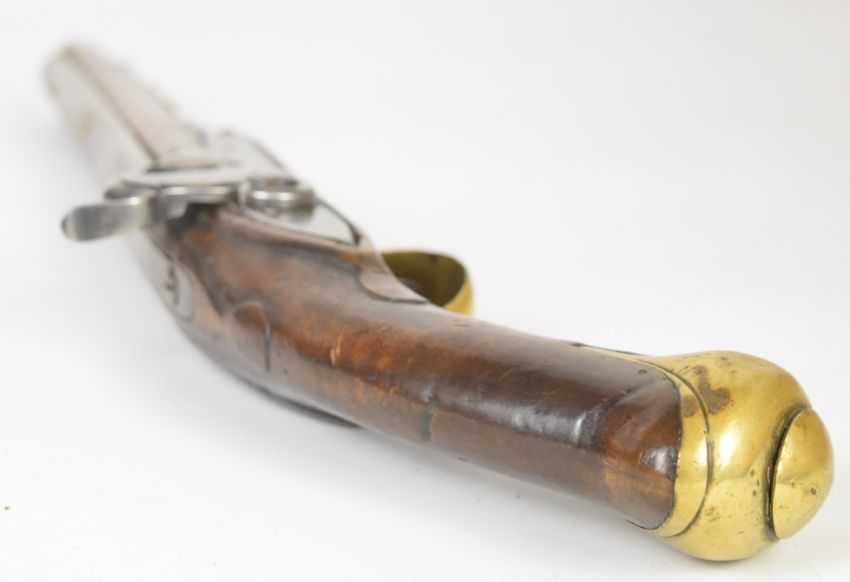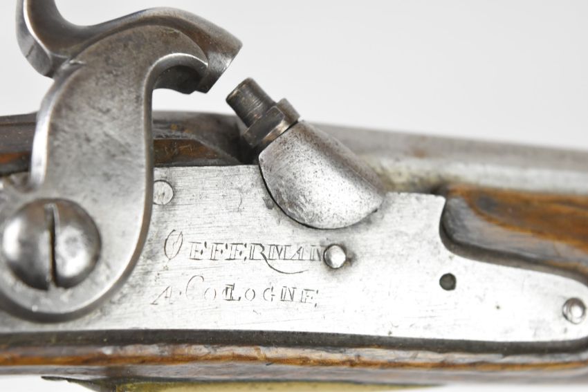 Friedrich Offermann German percussion converted from flintlock hammer action pistol with lock marked 'Offermann A Cologne', brass trigger guard, butt plate and mounts, brass tipped ram-rod, carved teardrop to the wrist and 9.5 inch smooth bored barrel, overall length 42cm.