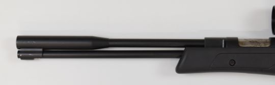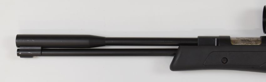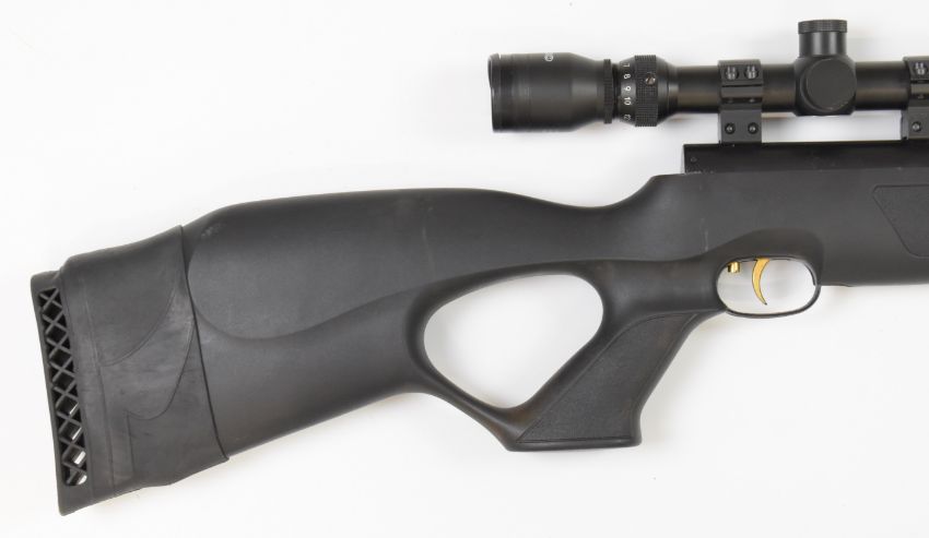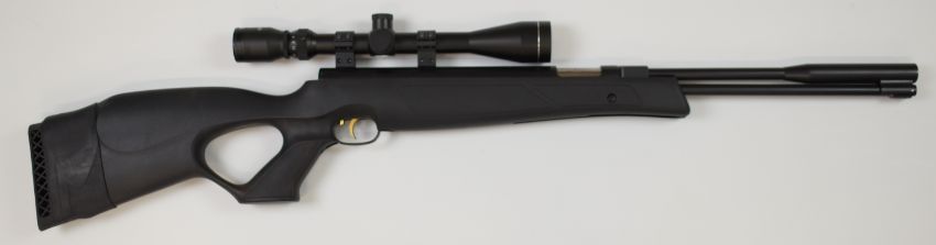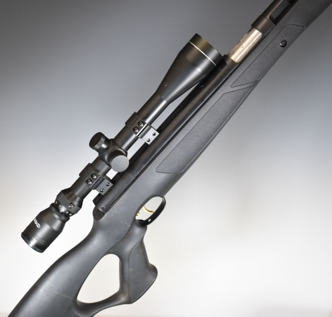 Weihrauch HW97K .22 underlever air rifle with composite stock, textured thumb-hole grip, raised cheek piece, adjustable trigger and Tasco 4-12x42 R scope, serial number 2378870.