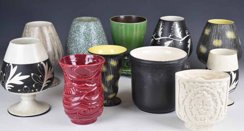 Collection of Beswick retro / mid century modern ceramics, mostly oversized goblets, chalices and jardinières in multiple patterns, shape numbers include 1656 (five patterns), 1858, 1083 etc, tallest 21cm