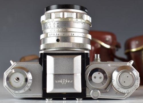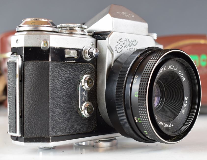 Two Edixa 35mm SLR cameras comprising Edixa Flex with Steinheil Quinon 1:1.9 5mm lens and Edixa Standard with Carl Zeiss Jena Tessar 2.8/50 lens, together with a spare viewfinder