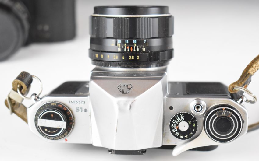 Three Pentax 35mm SLR cameras comprising two S1a and one Pentaflex SL, with two Takumar 1:2/55 and one Yashica 28mm 1:2.8 lens
