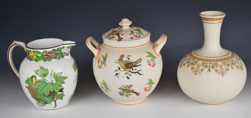 Copeland / Spode twin handled potpourri, pedestal vase and a jug with bird decoration, all with Worlock Collection labels to base