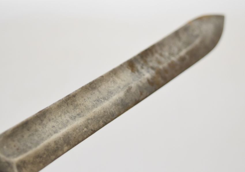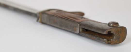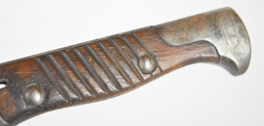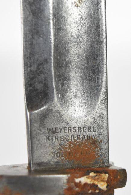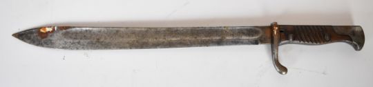 German WW1 98/05 pattern bayonet, later type with muzzle ring trimmed and fitted with flashguard, slatted wooden grips, Weyersberg Kirshbaum and Cie Solingen to ricasso and a 36.5cm fullered blade. PLEASE NOTE ALL BLADED ITEMS ARE SUBJECT TO OVER 18 CHECK ON COLLECTION OR DELIVERY