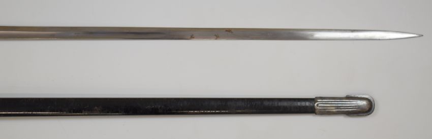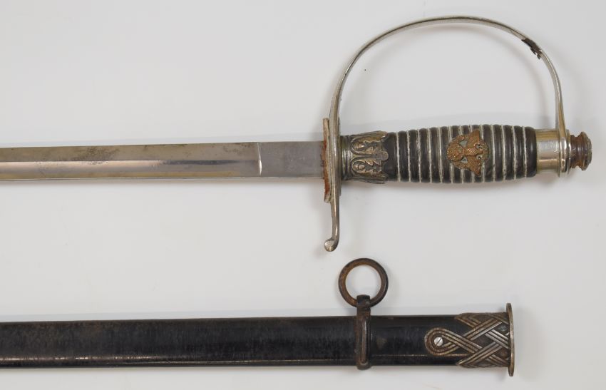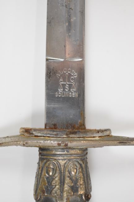 German WW2 Nazi Third Reich Police dress sword with eagle emblem to grip, Alcoso Solingen and maker's mark to ricasso, 85cm fullered blade and scabbard.PLEASE NOTE ALL BLADED ITEMS ARE SUBJECT TO OVER 18 CHECK ON COLLECTION OR DELIVERY