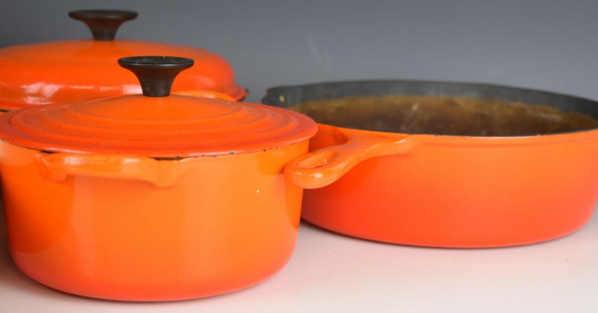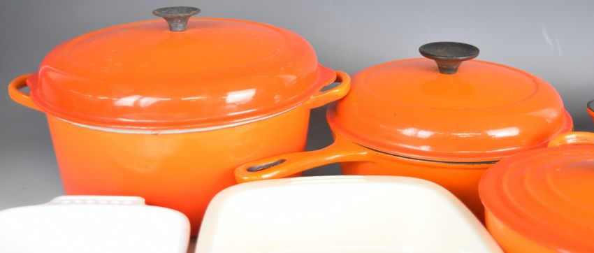 Le Creuset and similar pans and other cooking pots, the Le Creuset comprising three lidded pans with twin spouts, frying pan, two casserole dishes, one with lid and a shallow dish, together with a large red casserole marked Cuisine Royale France, two rectangular dishes and a small covered pot, all unmarked, largest Le Creuset pan marked 27 to underside
