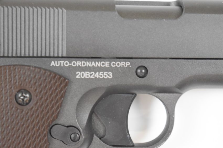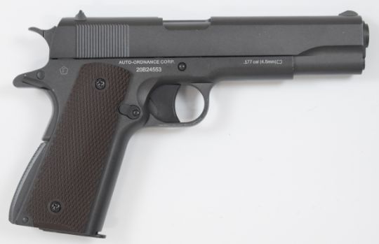 Cybergun 1911 A1 US Army .177 COair pistol with chequered faux wooden grips, multi-shot magazine and fixed sights, serial number 20B24553, in original box.