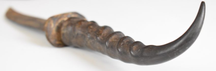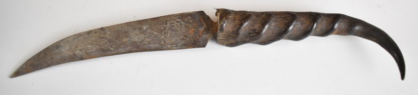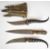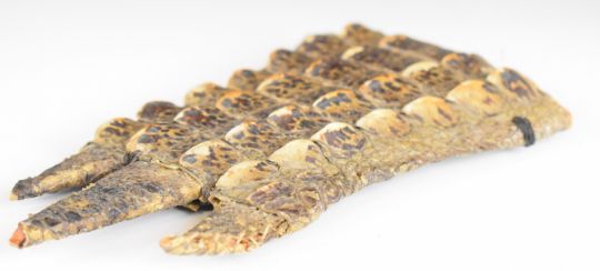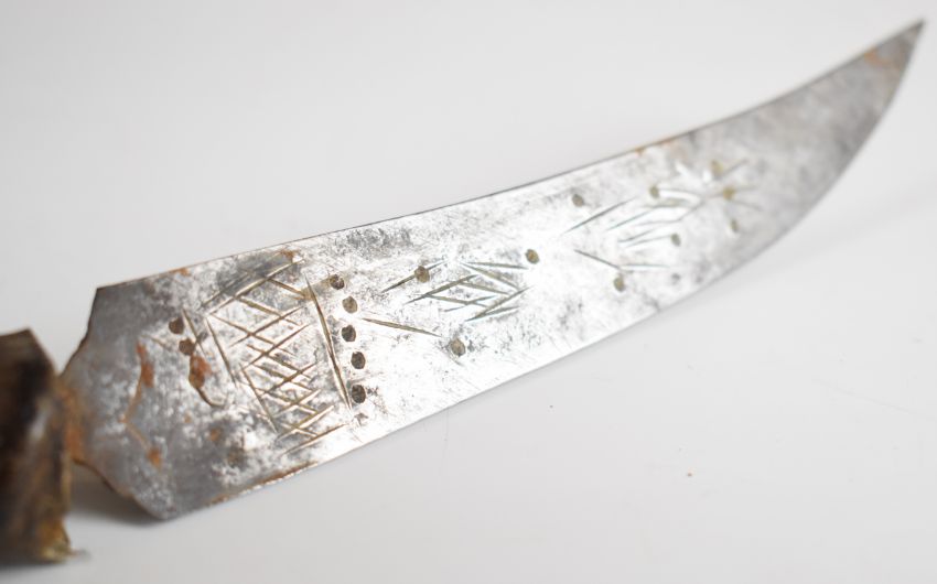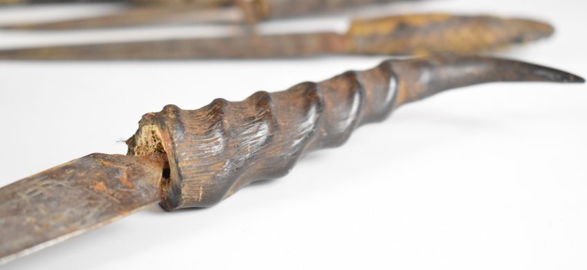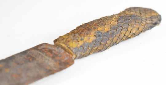 Sudanese / North African neck dagger set comprising crocodile or similar skin covered wooden pouch, housing two antler handle daggers both with crude decoration to blades, together with a further dagger with a double edged 19.5cm blade also with crude decoration and snake skin grip. PLEASE NOTE ALL BLADED ITEMS ARE SUBJECT TO OVER 18 CHECK ON COLLECTION OR DELIVERY