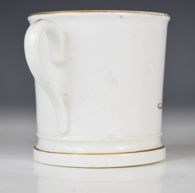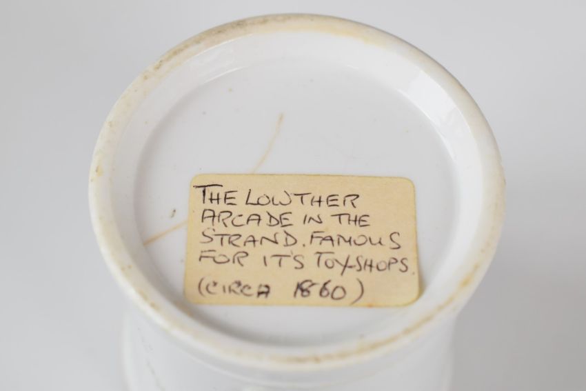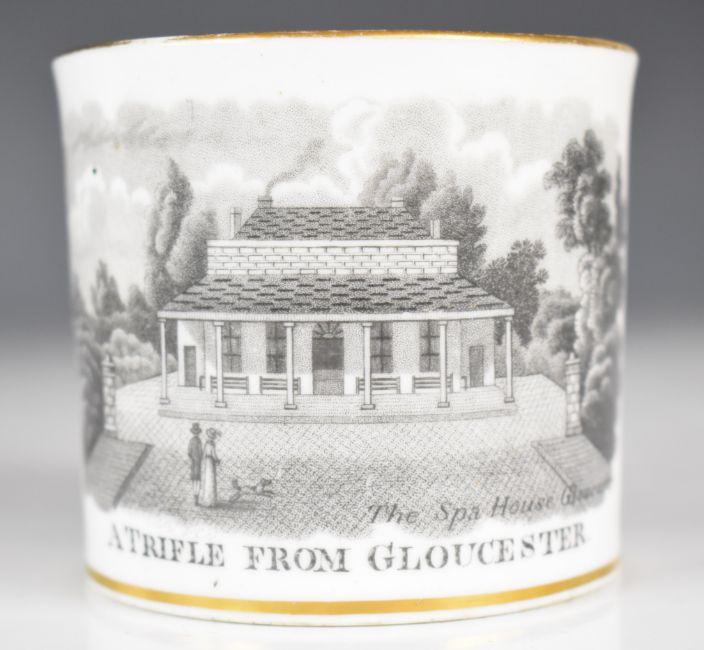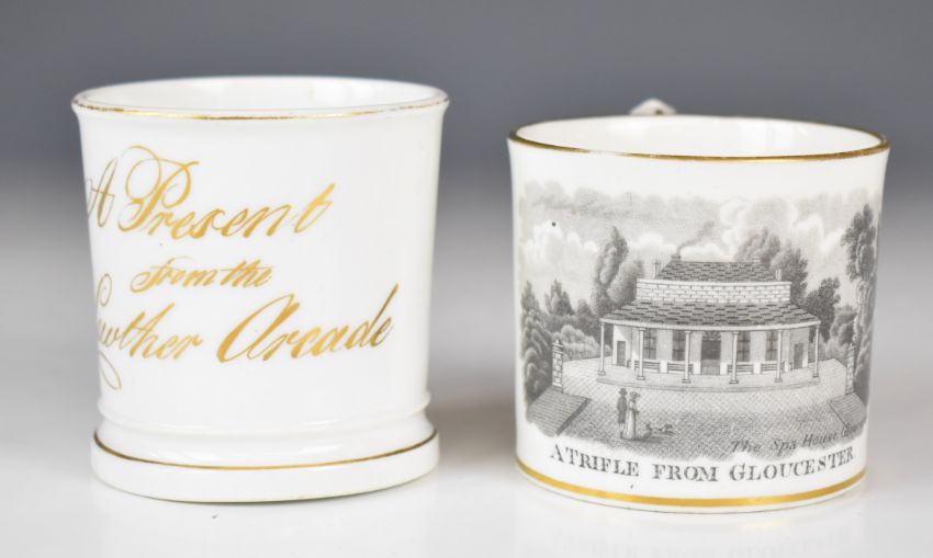 Two 19thC mugs comprising one from 'A Present From The Lowther Arcade' (in the Strand, famous for its toy shop) and a local interest transfer printed example 'A Trifle from Gloucester' with decoration of the Spa House, height 22cm