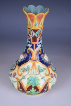Copeland majolica vase with mask decoration and Worlock Collection label to base, height 23cm