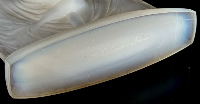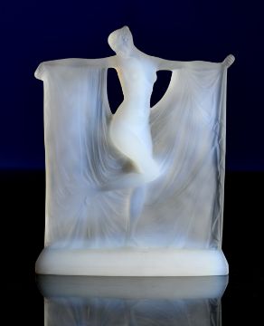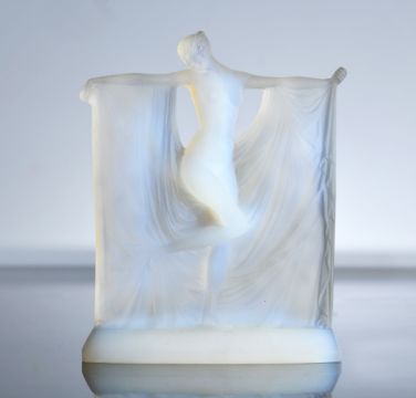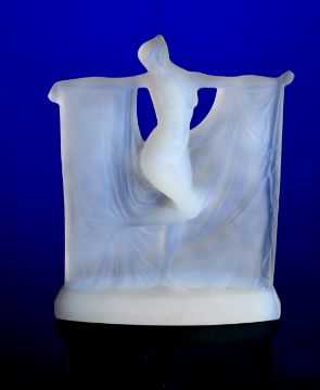 René Lalique Suzanne Art Deco satin frosted opalescent glass statuette, signed to base 'R Lalique France' to base, 22.4cm tall.