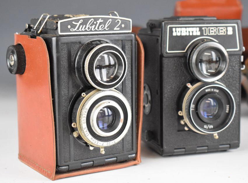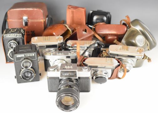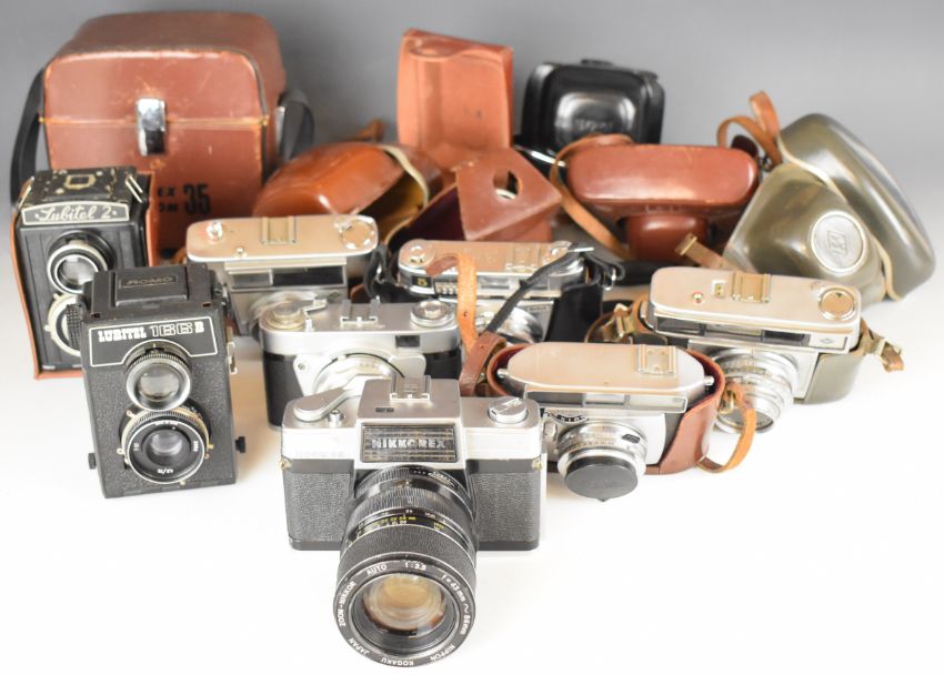 Eight collectable cameras comprising Nikkorex Zoom 35 with 1:3.5 f=43-86mm lens, Lubitel 2 and 166bB TLR cameras, Agfa Super Silette LX, Agfa Omtima II, Kodak Retinette IB, Altix-n and a Balda camera