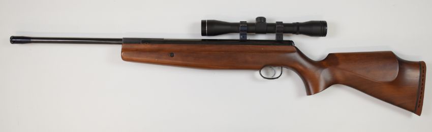 Webley Longbow .22 air rifle with semi-pistol grip, raised cheek piece, adjustable trigger and Webley 4x32 scope, serial number 911847.