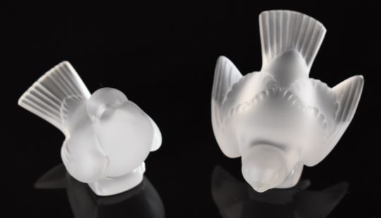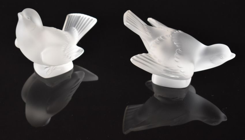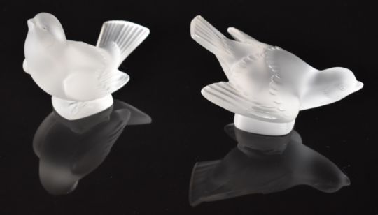 Two Lalique frosted glass sparrow paperweights, each signed 'Lalique France', largest 13cm long.