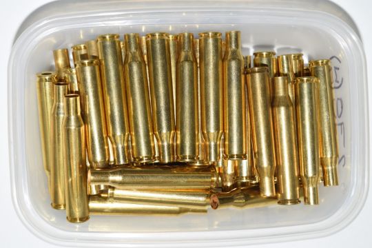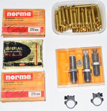A collection .270 rifle cartridge re-loading dies and empty brass cases.