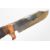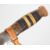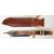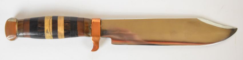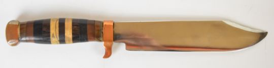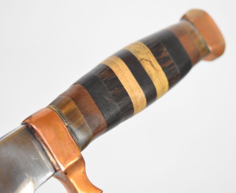Bowie type knife with banded wooden grip, copper guard and pommel, 18cm blade and leather sheath. PLEASE NOTE ALL BLADED ITEMS ARE SUBJECT TO OVER 18 CHECK ON COLLECTION OR DELIVERY