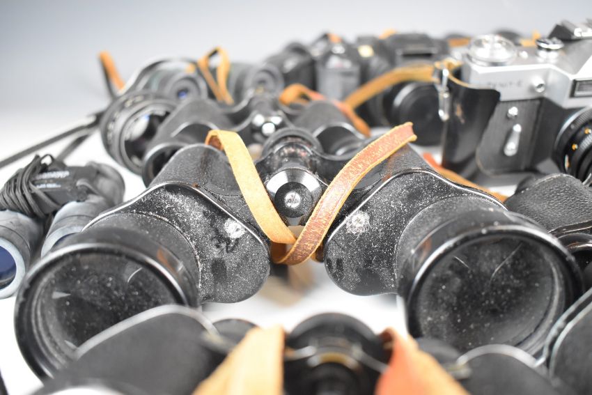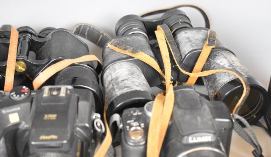 Collectable cameras, binoculars and lenses to include Panasonic DMC-FZ18 and Finepix S7000 digital cameras, Cosina 19-35mm 1:3.5-4.5 lens, Zenit-E 35mm SLR with Prinzgalaxy 35mm 1:3.5 lens, Pentacon 1.8/50 and Helios 44-2 lenses, No 2 Box Brownie, Optomax 10x50, Zenith 7x50, Nikon Aculon T01 8x21, Hunter 7x50, Tento 7x50 and Lumrop 8x25 binoculars