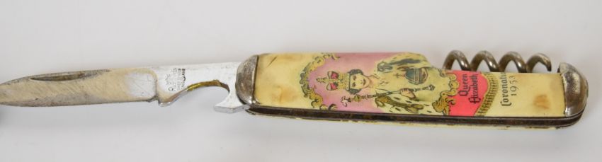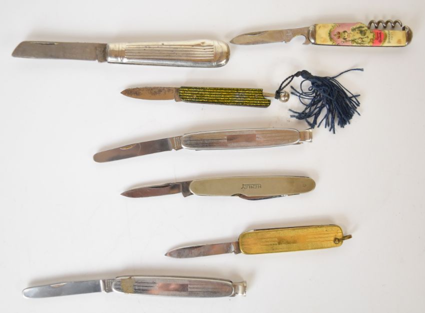 Seven pocket / folding knives including Rodgers Smoker's, Richards and a Queen Elizabeth Coronation example, longest blade 6cm. PLEASE NOTE ALL BLADED ITEMS ARE SUBJECT TO OVER 18 CHECK ON COLLECTION OR DELIVERY