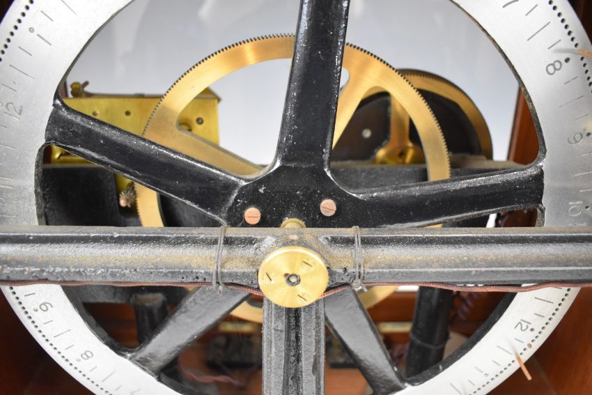 Gents electric master clock system bell or similar timer, with hours, minutes and day of week wheels, overall height 40cm