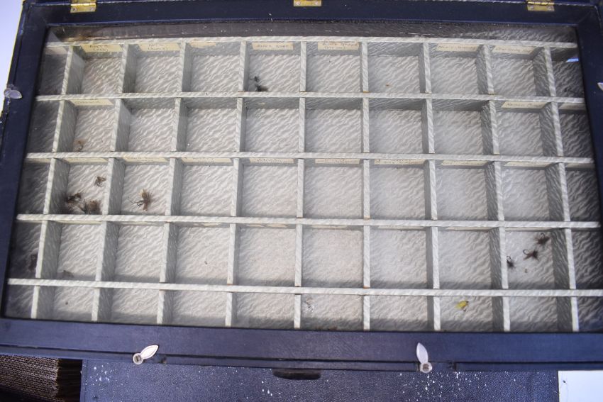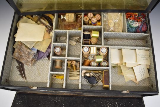 Vintage shop / haberdashery fly tying / fishing fitted travelling salesman's case with three sectional drawers with trout fishing flies, folding perspex lids and fitted top layer with contents, W60 x D36 x H19cm
