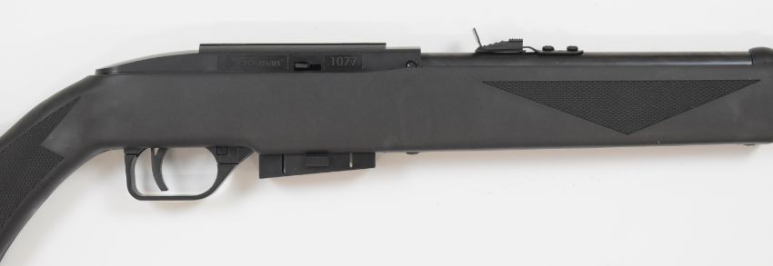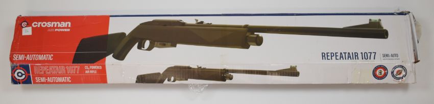 Crosman Model 1077 repeater .177  COair rifle with chequered semi-pistol grip, composite stock, adjustable sights and 4x40 scope, serial number 822B00352, in original box with instructions.
