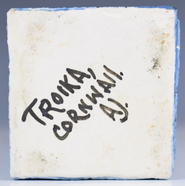 Troika pottery rectangular vase with carved and incised decoration in colours against a blue ground, Troika Cornwall and AJ monogram to base, height 22.5cm
