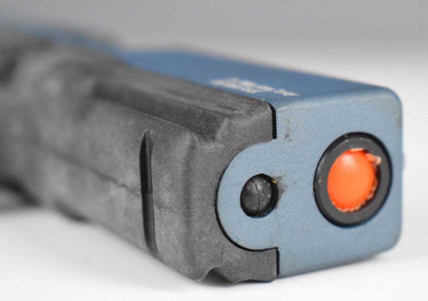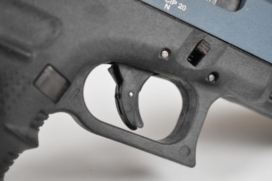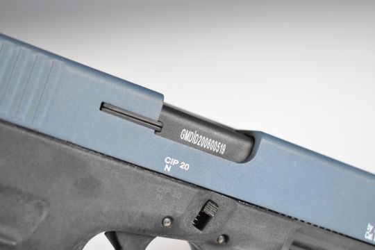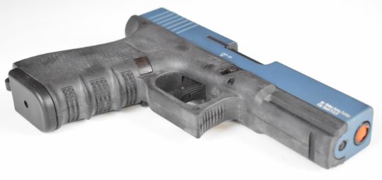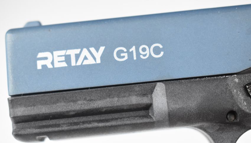 Retay G19C 9mm blank firing pistol with textured grips, serial number 2060519, in padded hard carry case with accessories.