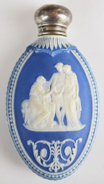 Wedgwood Jasperware scent / perfume bottle with hallmarked silver mount decorated with classical figures, height 8.5cm