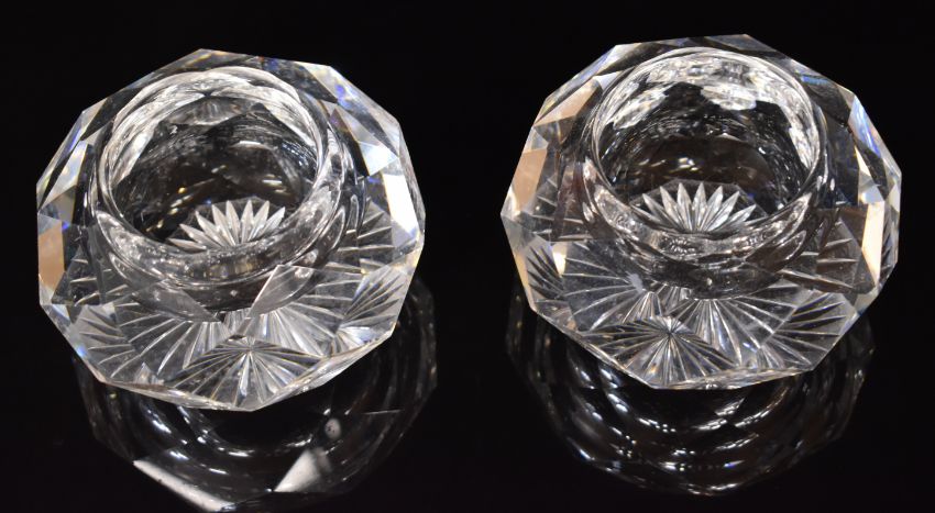 A set of eight faceted cut glass table salts with star cut bases, in fitted oak case.