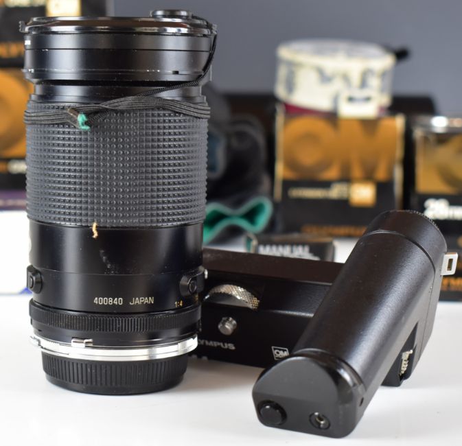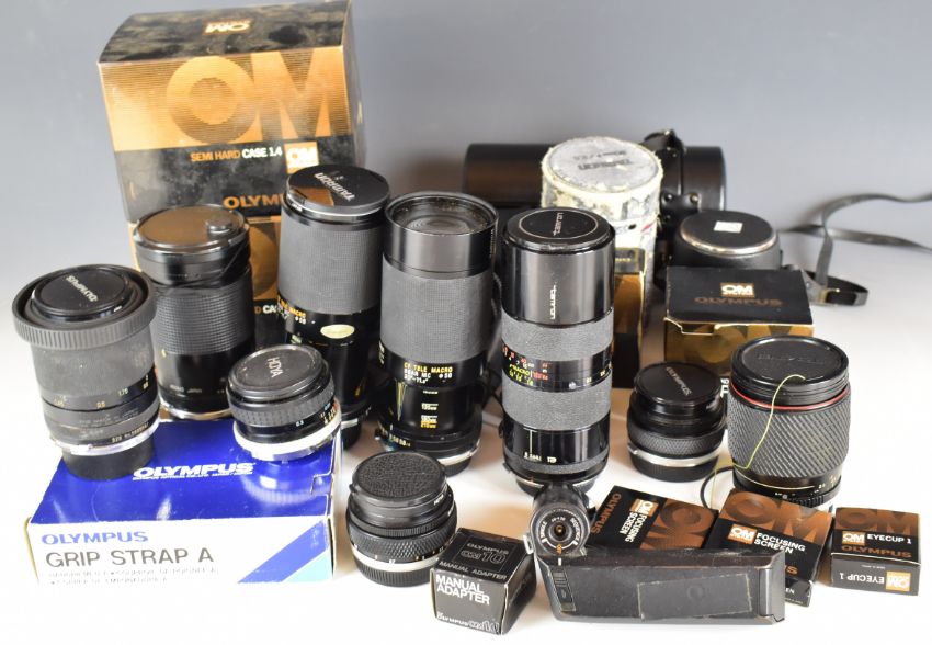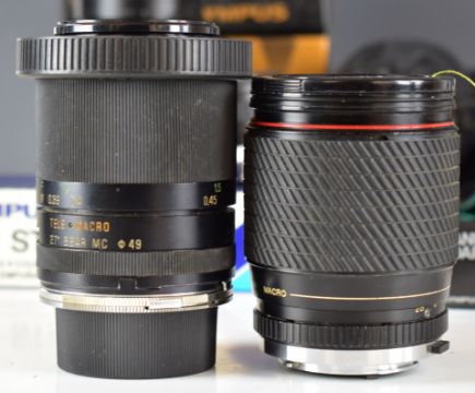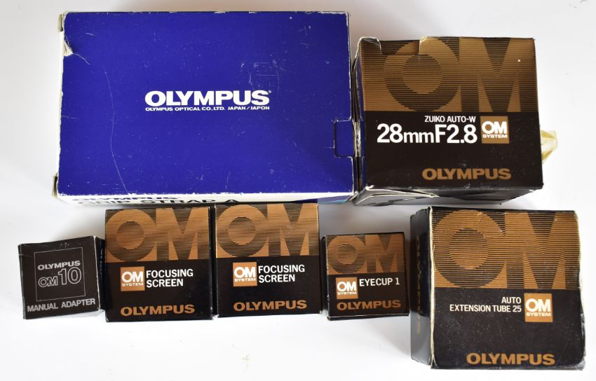 Olympus 35mm SLR camera lenses and accessories including Zukio Auto-S 50mm 1:1.8 and Zukio Auto-W 28mm f2.8 lenses, Tamron 85-210mm 1:4.5, 80-210mm 1:3.8, 28-135mm 1:4-4.5, 90mm 1:2.5 and another 80-210 1:3.8 lens, Tokina 28-105mm 1:4-5.3 lens, Hyoa 28mm 1:2.8 lens, Olympus grip strap A, focusing screen, 25 extension tube and Winder 2