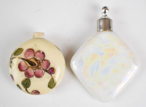Two perfume or scent bottles with decoration of a lady and beau and a circular example, probably Royal Worcester