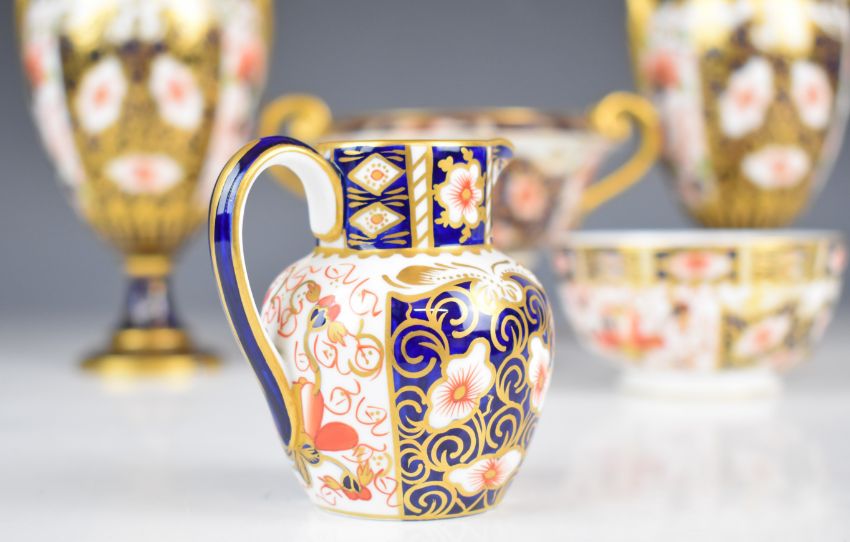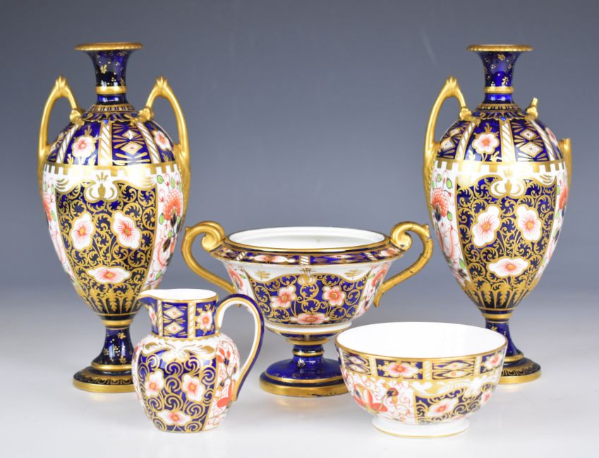 Royal Crown Derby Imari pair of pedestal vases, twin handled urn, bowl and jug, tallest 21cm