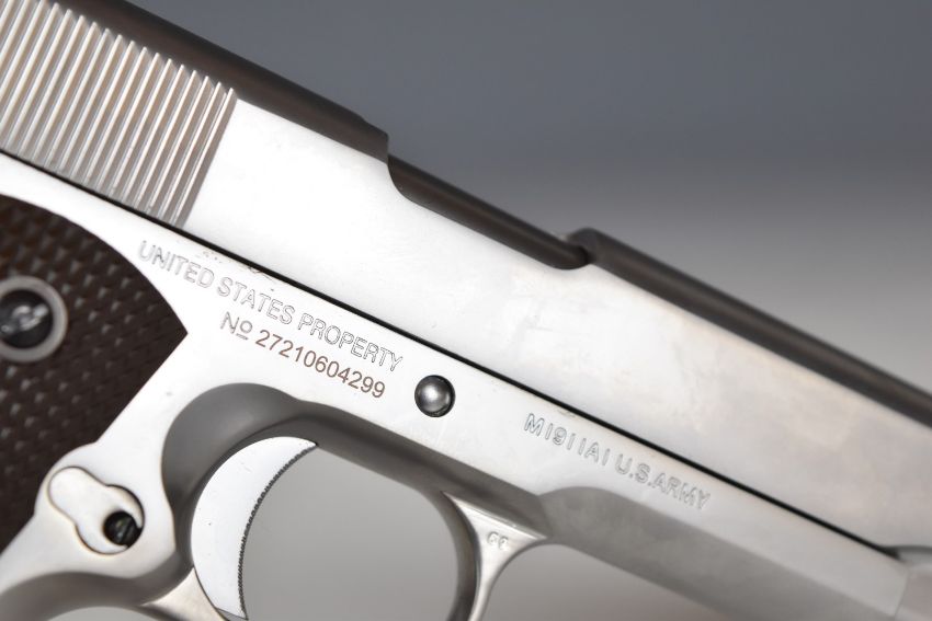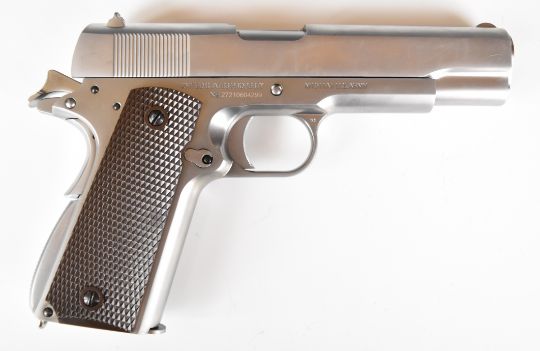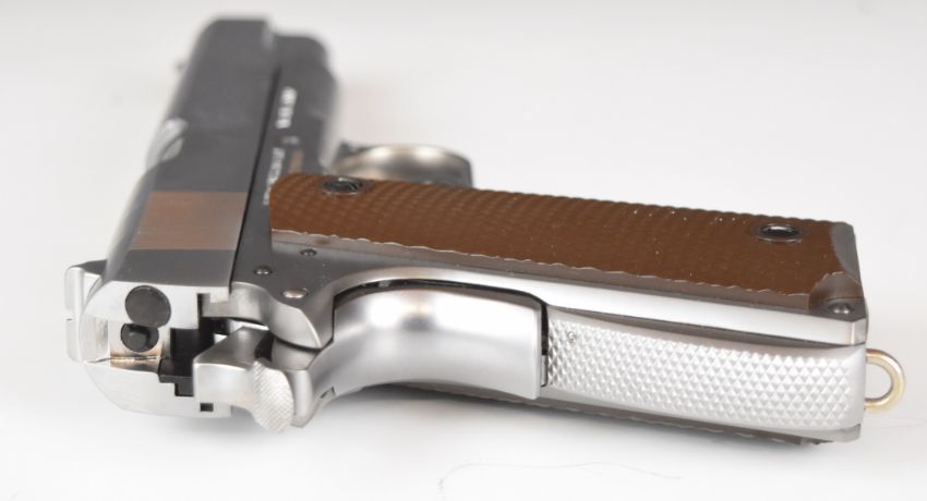 Cybergun Colt 1911 6mm COairsoft pistol with chequered faux wooden grips, multi-shot magazine and fixed sights, serial number 27210604299, in original box with instructions.