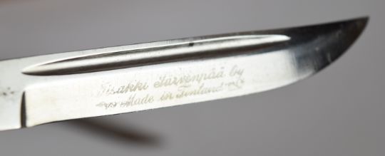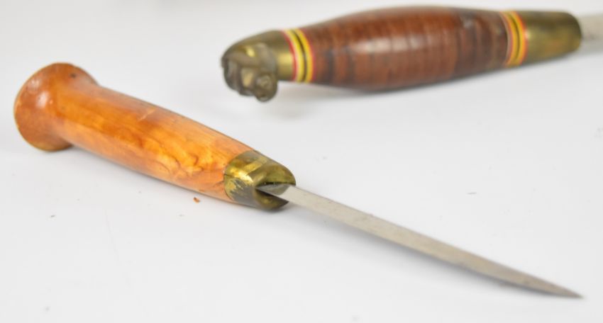 Four Finnish hunting / skinning knives including a pair, longest blade 14cm, all with leather sheaths. PLEASE NOTE ALL BLADED ITEMS ARE SUBJECT TO OVER 18 CHECK ON COLLECTION OR DELIVERY