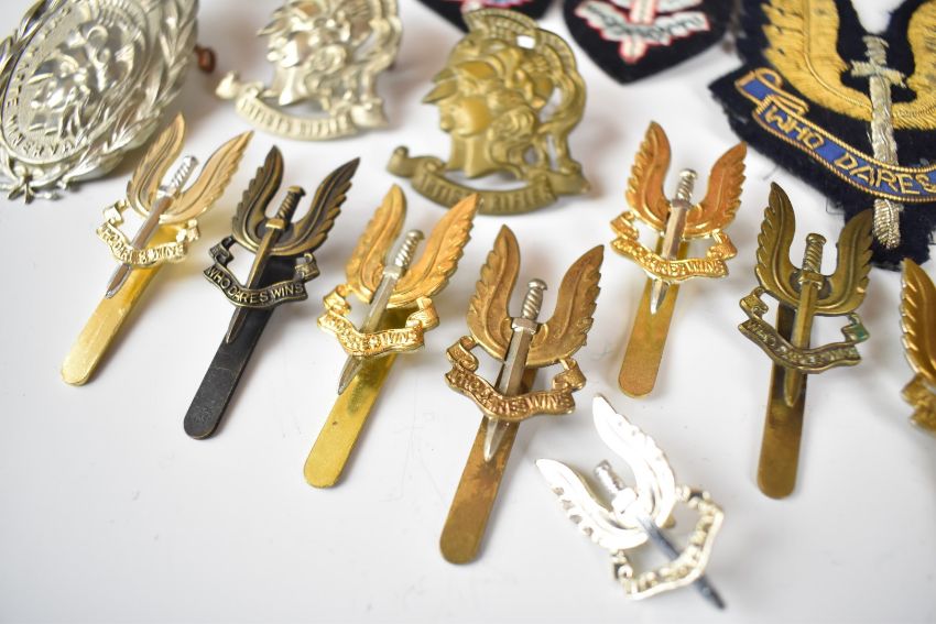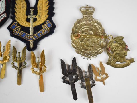 Collection of twenty two British Army Special Air Service badges and insignia including cap badges, cloth and metal qualification wings, Artists Rifles and blazer badge etc, some restrikes