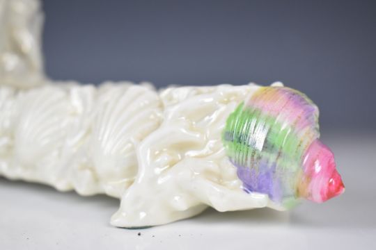 A 19thC majolica figural centrepiece / jardinière with figure holding a small dog, Phillips and Pearce, New Bond Street mark to base, possibly Royal Worcester, H23 x W47cm