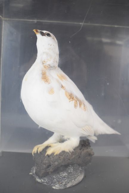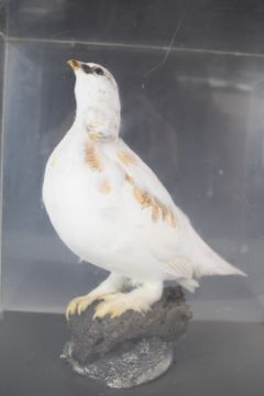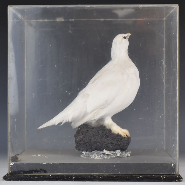 Taxidermy study of a ptarmigan on naturalistic base, in perspex case, 36 x 37 x 23cm