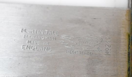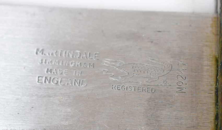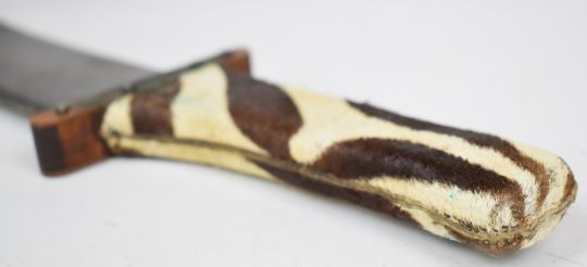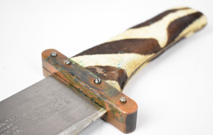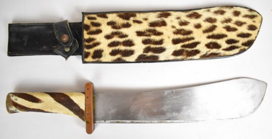 Marindale 'machete' style knife, No 247 to 33.5cm blade, copper cross guard, skin covered grip and part skin cover to sheath. PLEASE NOTE ALL BLADED ITEMS ARE SUBJECT TO OVER 18 CHECK ON COLLECTION OR DELIVERY