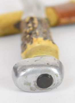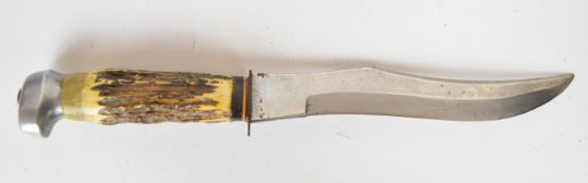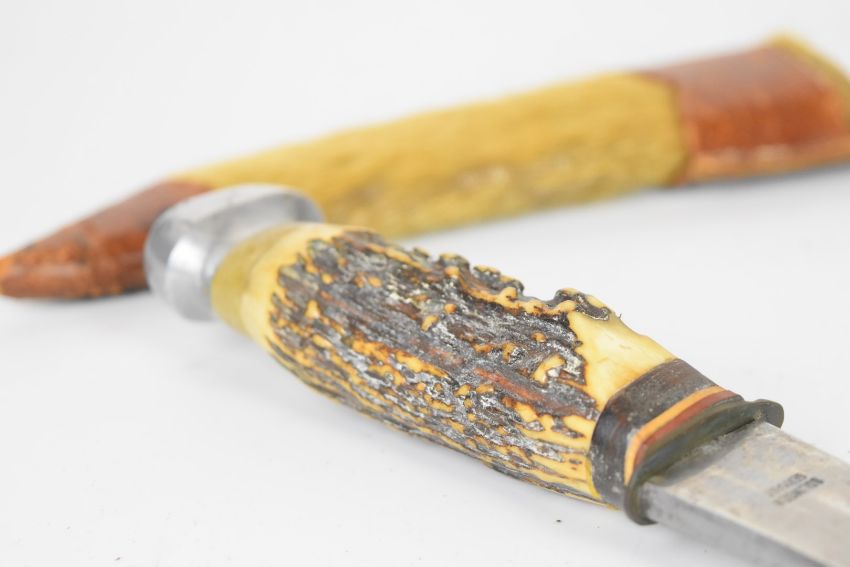 German hunting knife 'Siberian Skinner' marked Solingen to ricasso, with horn or similar grip, 20.5cm blade and skin covered sheath. PLEASE NOTE ALL BLADED ITEMS ARE SUBJECT TO OVER 18 CHECK ON COLLECTION OR DELIVERY